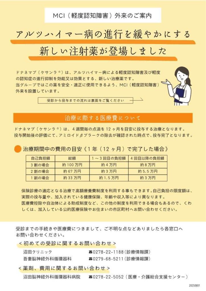 沼田クリニックではアルツハイマー病の進行を緩やかにする新しい注射薬の投与開始前チェックシートをもとにした問診や、簡単な記憶力の評価、適応について判断すべく頭部MRIによる評価を行っています。