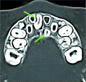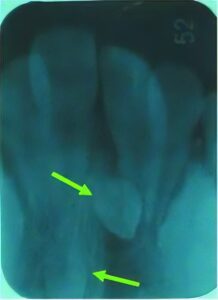 上顎の左右切歯の間に、余計な歯(過剰歯)が埋まっていることがあります。上顎前歯の歯並びに影響する場合、抜歯が必要になることもあります。