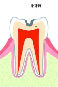 虫歯が進行しエナメル質の奥にある象牙質に達した状態です。冷たい物でしみるようになります。