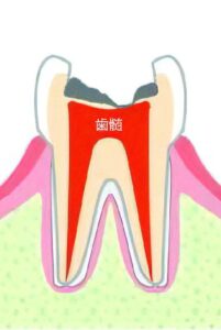 虫歯が神経まで達しており、炎症を起こします。常に痛みがあったり、歯ぐきが腫れたり、刺激により激痛が走る場合は、ここまで進行しています。根管治療が必要になり、治癒するまで非常に時間がかかります。(一ヶ月程度、場合によっては数ヶ月~数年を要する)