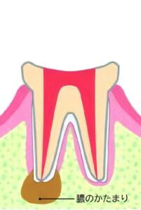 歯髄炎がさらに進行し、歯根の先の骨の中に炎症が起きた状態です。また、以前に根管治療を行った歯牙でも根管内に細菌が残っていたり、何らかの理由で再感染をすることにより、根尖に炎症を起こすことがあります。再度、根管治療を行う必要になります。
