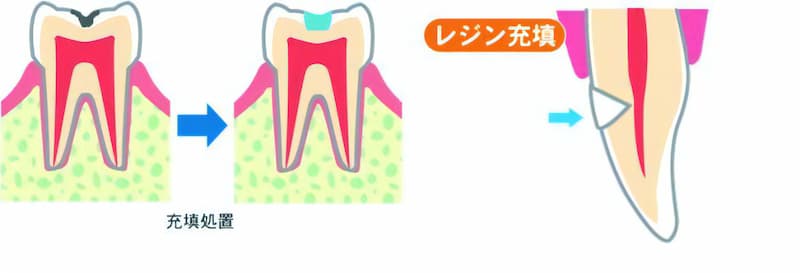 虫歯の部分を削り、削った部分をレジン等の補綴物で埋める治療です。