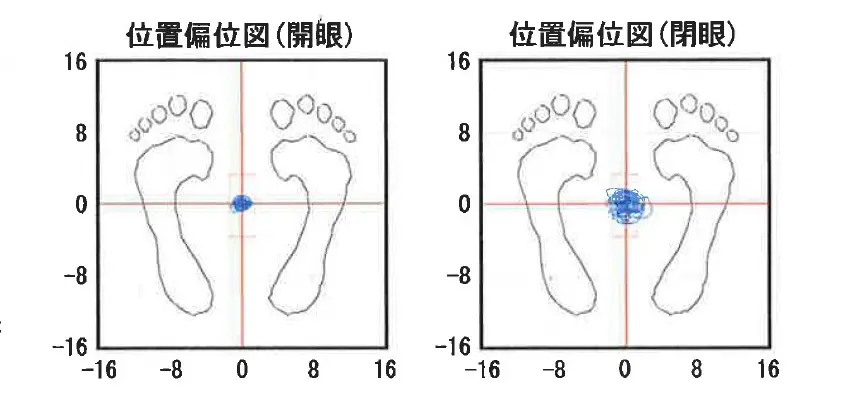 直立姿勢に現れる身体の揺れを記録・解析を行い、平衡(バランス)機能を調べます。