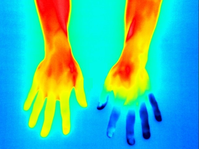 体表から放出される赤外線の量を赤外線放射線温度カメラで認知し、皮膚表面の温度分布を測定します。