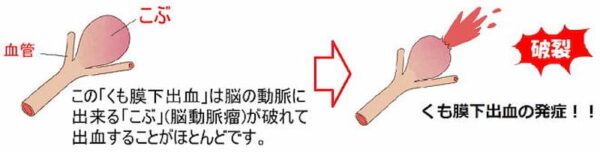 従ってくも膜下出血にならないためには、まず「脳動脈瘤(こぶ)」があるかないかを見いだし、破れる前に出血しないように処置をすることが大事になります。
