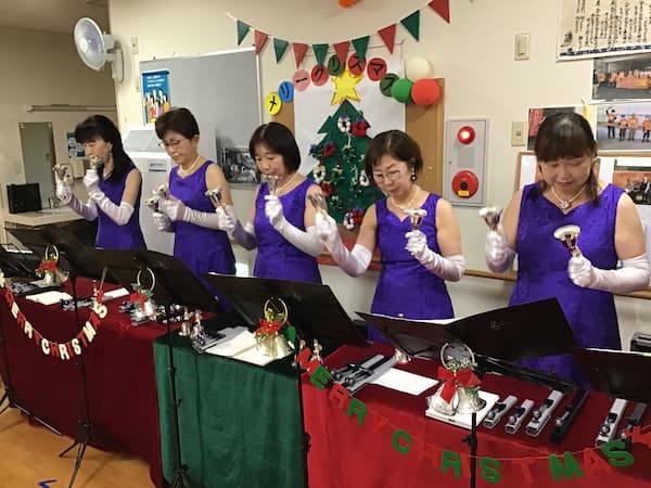 午後は、昨年も来訪していただいた「ベルコーロ」の皆様に、ハンドベルとトーンチャイムの楽器演奏やクリスマスソングなどの歌を歌っていただきました。