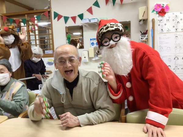 また、職員もサンタクロースやトナカイに扮し、手作りのソリにクリスマスプレゼントを乗せて一人一人に届ました。「あんた、誰だい?」等、笑顔で話しかけてくださる利用者様と賑やかに楽しく、美味しく、クリスマス会を行うことができ、利用者様の良い思い出の一つになってもらえたのではと思います。