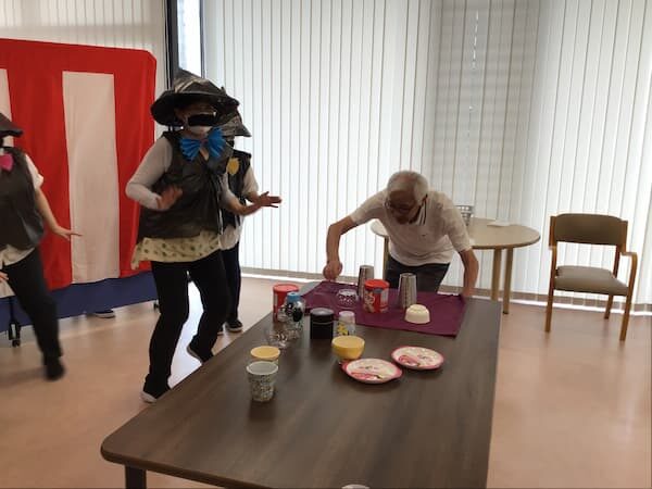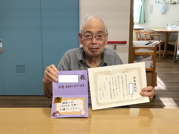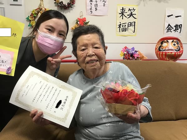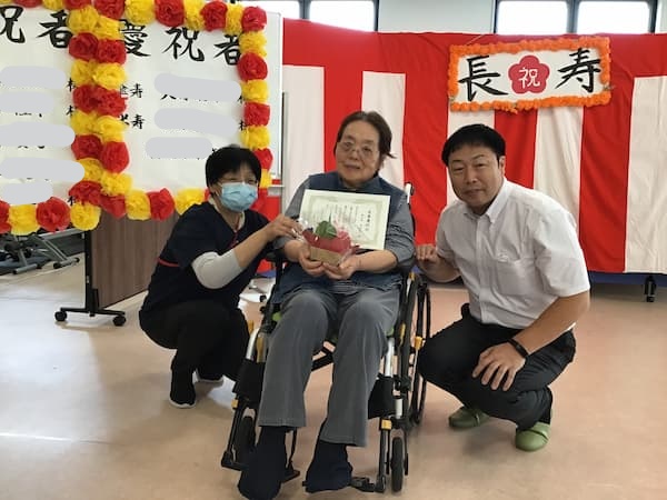 令和7年9月11日に一階の地域交流にて、ナーンシンングケア本町通りと特別養護老人ホームの合同で敬老会を開催しました!!                      ナーンシンングケア本町通りでは、米寿の方が2名、傘寿方が1名、お花と賞状を施設長から渡して頂きお祝いしました。                        職員は、お祝いの出し物としてマジックショーを行い利用者様も参加されとても盛り上がりました✨