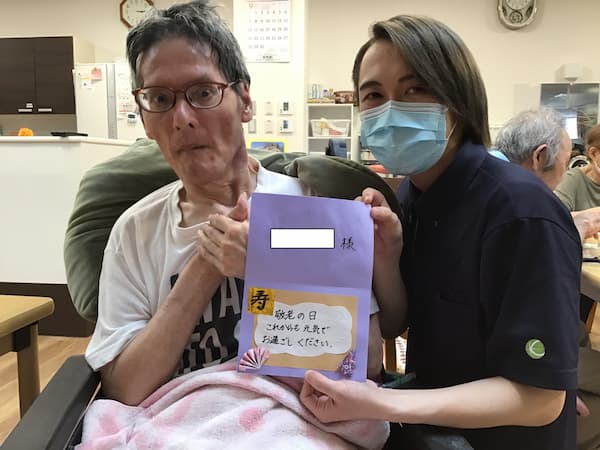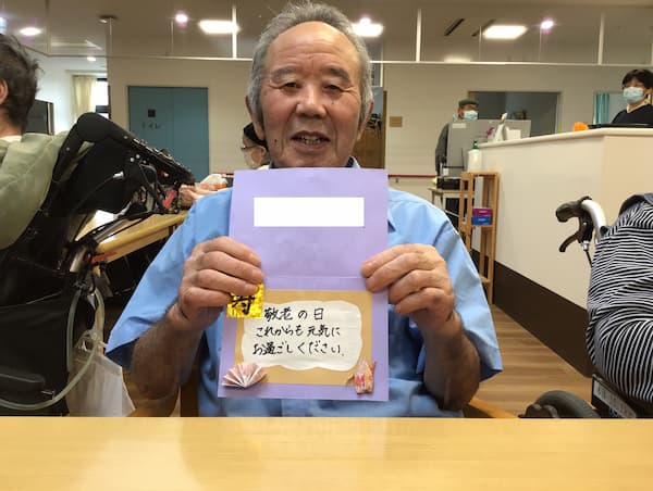 利用者様全員に、職員の手作りカードに日頃の感謝の気持ちを言葉にしてお伝えする事ができました⭐                                  おやつには、近くの美味しい練り物和菓子を皆さんで召し上がり、「きれいね。」「素敵で食べられない。」と目で楽しみつつお味もとても美味しかったと好評でした🐇